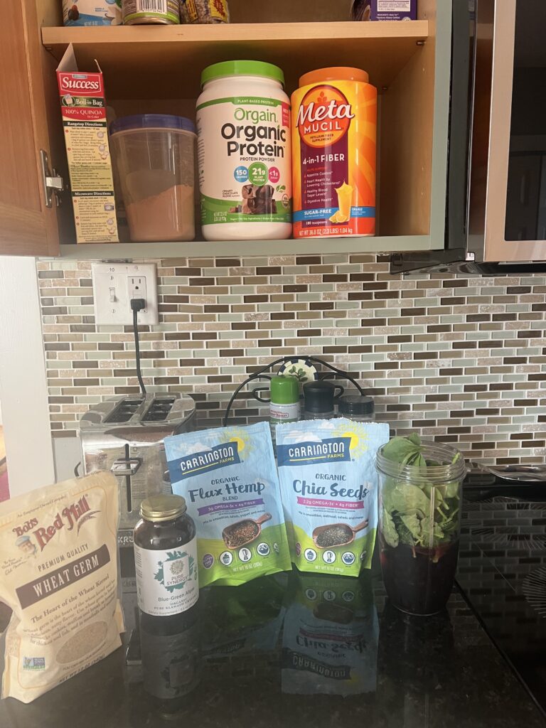 • 1 tbsp Meta mucil – extra fiber – we don’t get enough not only does it regulate us, it helps us stay fuller longer so we don’t snack as much – win, win – get your fiber in.