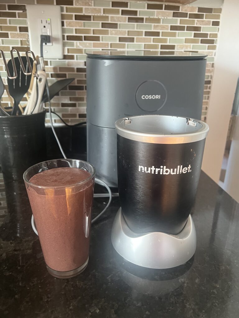 With my nifty little nutra-bullet, which I L-O-V-E. I’ve started to enjoy this little treat each morning and honestly my energy, concentration, etc, etc. have improved.